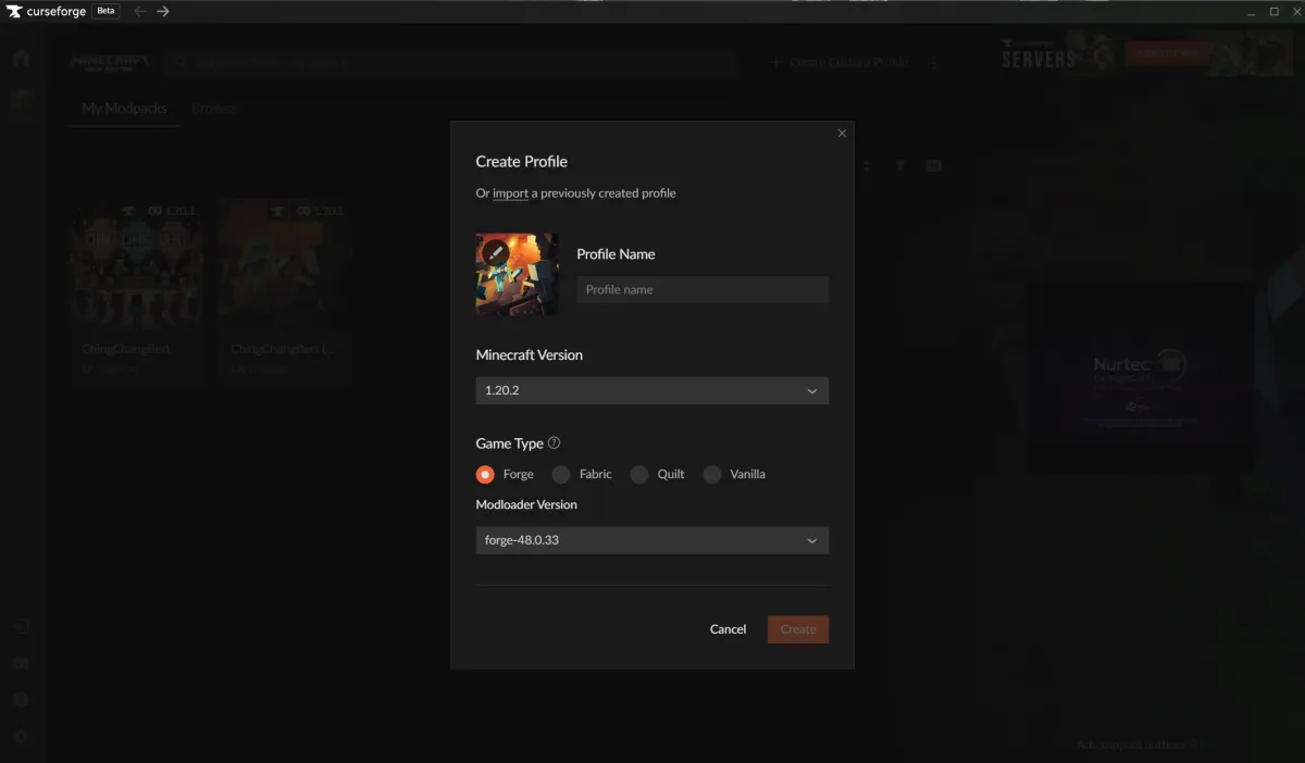 Importing the custom profile so that the modpack is installed correctly and all the mods are there.